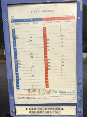 小川町駅からは、イーグルバス白石車庫行き(8:16発)に乗って、皆谷で下車。乗車時間はだいたい30分くらい。