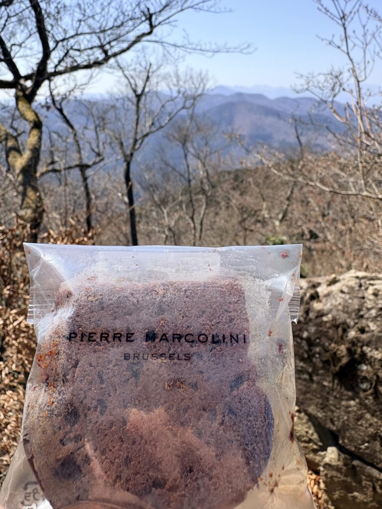 山頂で食べたのは、カップヌードルと、ピエールマルコリーニのチョコレートケーキ。